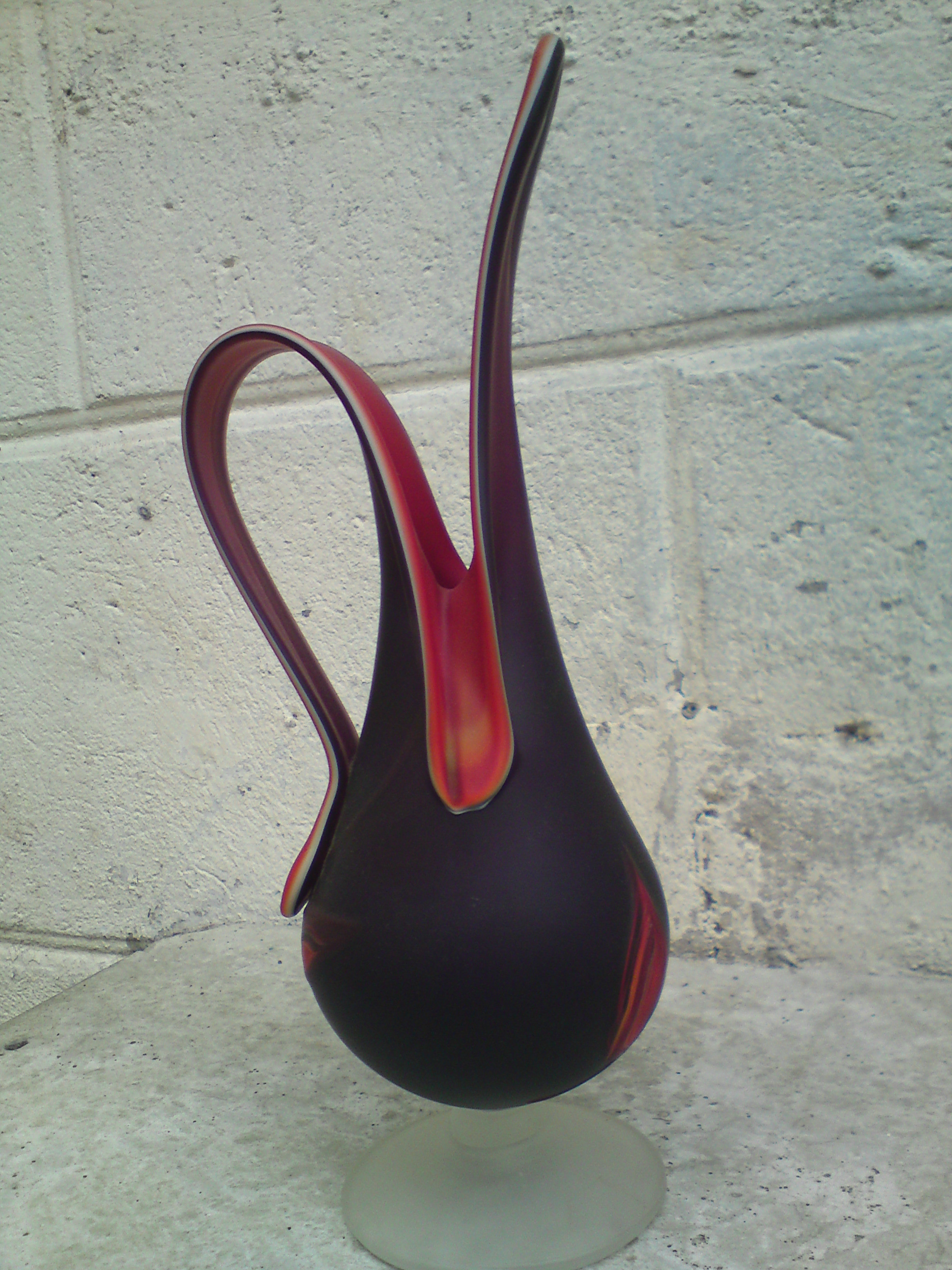 Ce vase est fait en pâte de verre et réalisé artisanalement d'où la marque de la canne sous le pied...il est de couleur noire limite violet très foncé, avec à certains endroits des formes arrondies de couleurs rouge et orange, il est vraiment magnifique et original avec sa forme carafe...Je m'en sépare, tout comme d'autres à venir, car j'en ai trop chez moi et qui me tiennent plus à coeur, donc, celui-ci je le vend 35 euro , à cela ajouter un peu moins de 10 euro, je me renseigne au plus vite auprès de la poste, pour les frais de port, car ce serai pas mal de prendre l'option la plus sécurisée, vu la fragilité de l'objet...Si vous désirez ce superbe vase il vous suffit de "me contacter par mail" (en haut à droite), ansin nous pourrons discuter du prix, du mode d'envoi, des frais de port...si besoin je peux fournir d'autres photos ou vous donner d'autres renseignements.